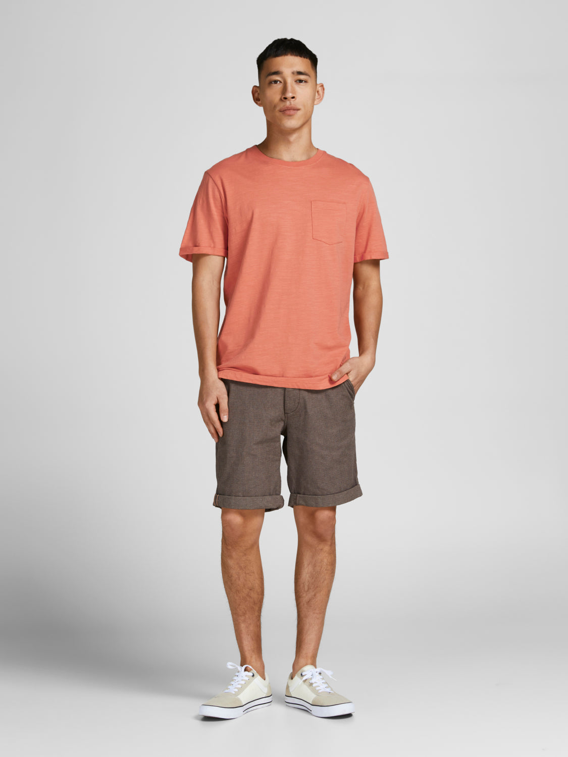 Casual and easy all day wear. Slub fabric made with two different yarns to create a slub texture. - Style type : T-shirt - Sleeve Length : Short Sleeves - Sleeve type : Sleeves with a fold up - Neckline / Collar : O-Neck - Pockets : Chest pocket